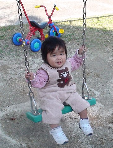 DSC00268re_ms.jpg今日は11月とは思えないくらいのぽかぽか陽気でした。お母さんがお昼ご飯を支度する間、近くの公園のブランコに乗せました。大丈夫かなーと思ってましたが、しっかりと鎖を握りしめゆらゆら揺れるのを楽しんでました。揺れが止まるとまだ言葉にもならないのに揺らせと催促をします。
