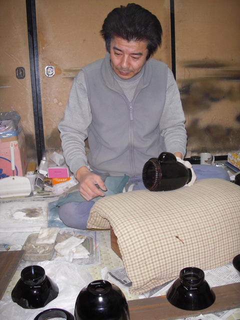 写真の彼は自分が独立してからおつきあいをさせていただいている職人さんで、細かな対応にも応じてくれる腕の良い呂色職人さんです。