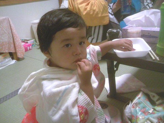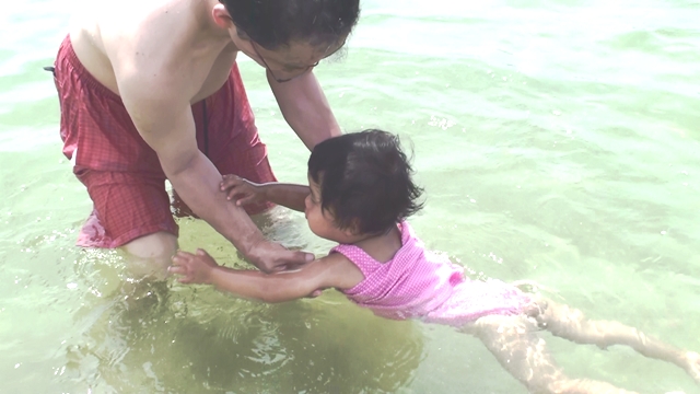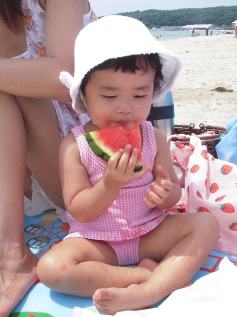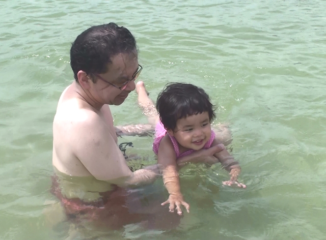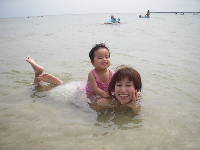 娘にとっては初めての海水浴。はじめは波に戸惑ってしがみついて自分から離れようとしませんでしたが、そのうち楽しくなってきたようで、海の中でも「もいっかい。もいっかい。」とせがまれました。