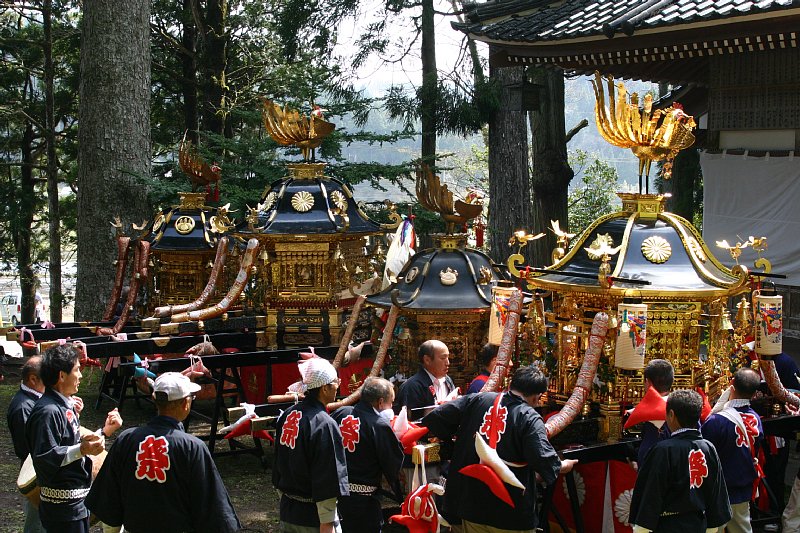 小さな村祭ではありますが村の神社の境内に漆塗りの御神輿が6基も並ぶ姿は勇壮です。