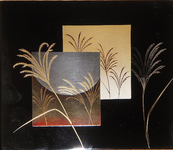 試験は実技試験と学科試験があります。実技の課題はお椀の展開図面に秋草をテーマに作図する事とススキをモチーフにバックに色紙を入れたパネルの図案作成。そしてその図案を元にに二枚の色紙をそれぞれ丸粉、平粉の仕事で仕上げ、上絵にススキを描き艶上げをして完成させます。